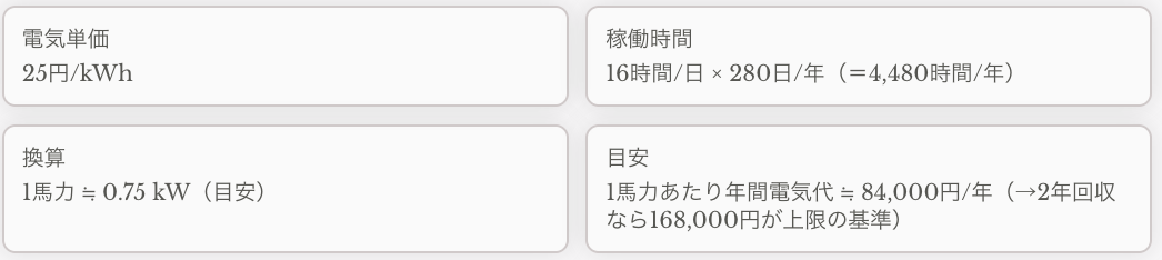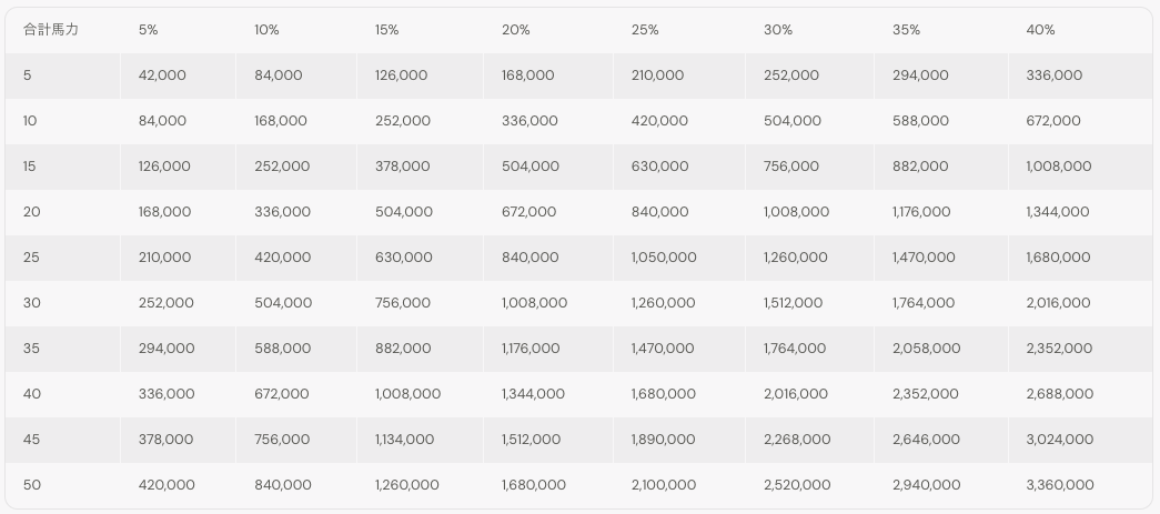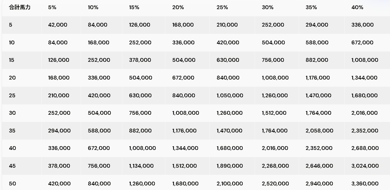 たとえば「合計馬力 20」「削減率 15%」なら、