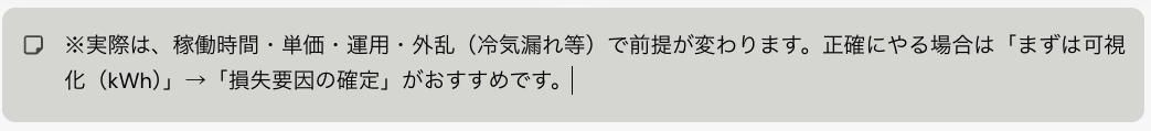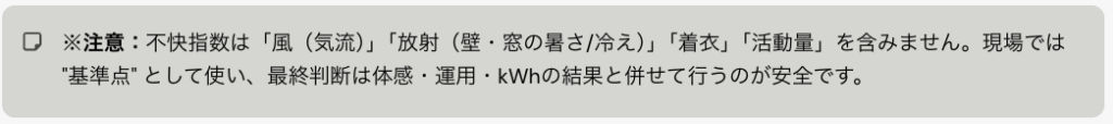 使い方:室温と湿度を見て、この帯に入るように(特に夏は「除湿」も含めて)運用設計します。"快適さ"を守りながら、ムダな設定下げ(kWh増)を防ぐ、という考え方です。