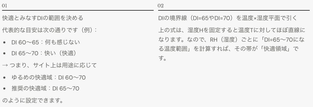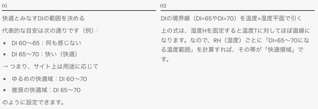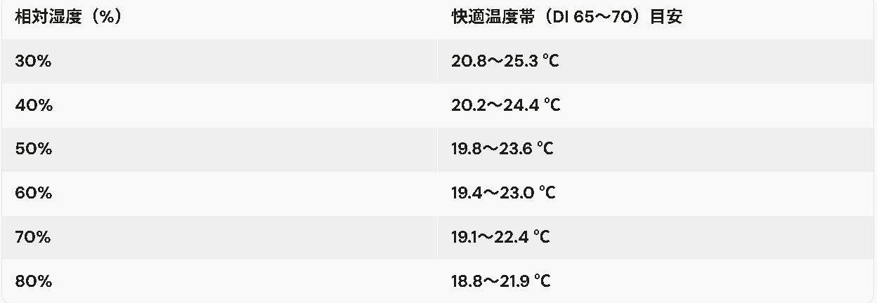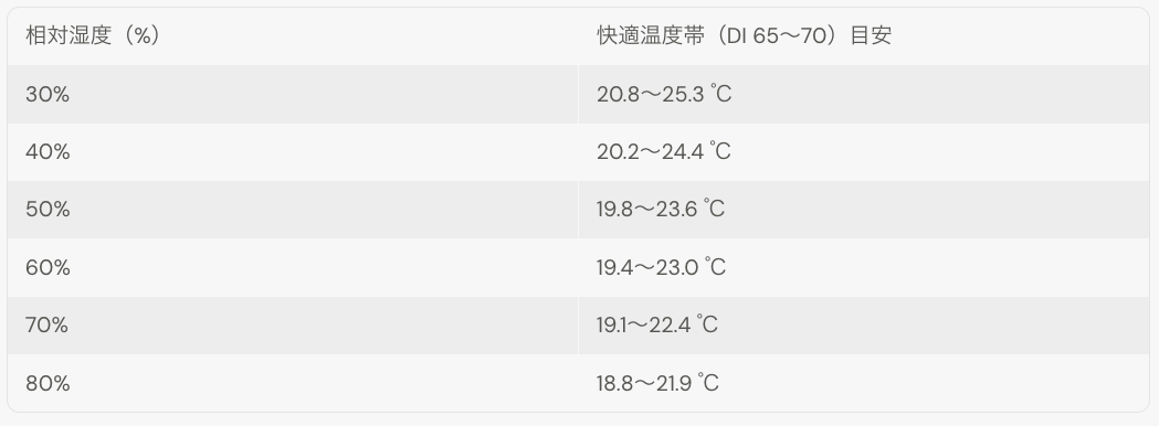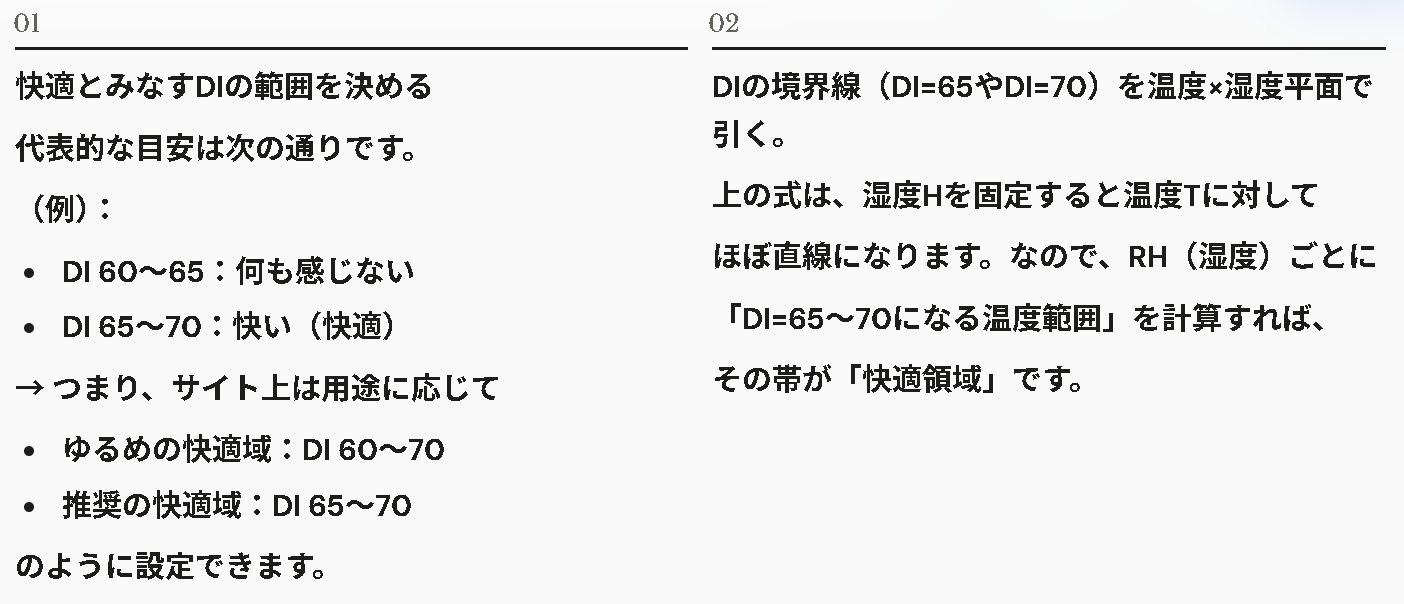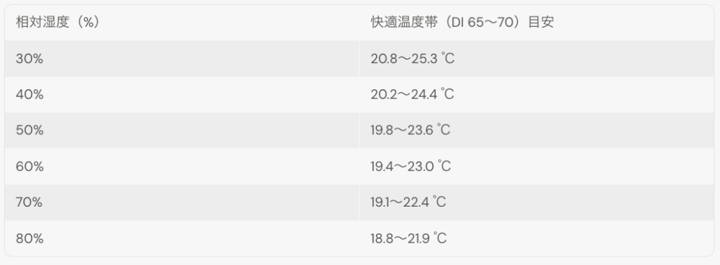 「湿度ごとに、快適(DI=65〜70)になる温度帯」を出すと、サイトで説明しやすくなります。