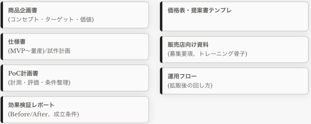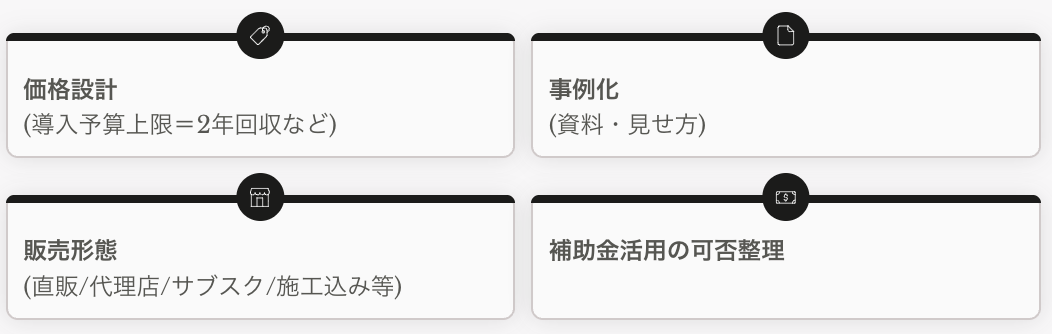 成果物:価格表、提案書テンプレ、販売導線設計(Web/営業)