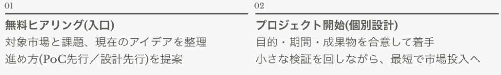成果物:PoC計画書、検証レポート(成立条件・改善点・次の改良案)