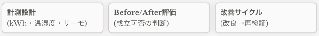 空調省エネはニーズが大きい一方で、現場にはまだまだ「改善のための器具や装置」が足りません。このサービスでは、現場の損失構造(外乱・気流・運用・劣化・冷気漏れ等)から逆算し、売れる形・成立する形で商品化するところまで伴走します。