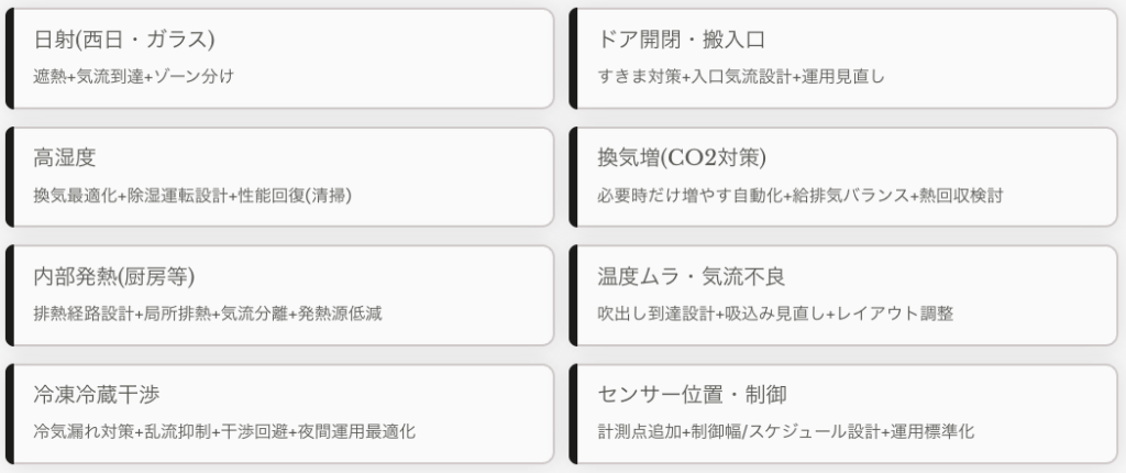 気象(外気)だけでなく、建物(断熱・すきま)、人の動き(出入り・人数)、換気(外気導入)、内部発熱(厨房・機械・照明)、気流(温度ムラ)、計測・制御(センサー位置)、機器状態(汚れ・劣化)にもまたがっています。
