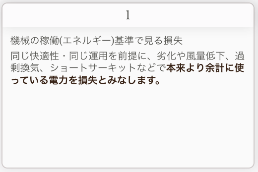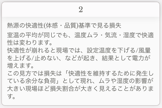 外乱や運用、気流ムラ、換気過多などが重なると、同じ快適性を得るために余計なエネルギーが上乗せされます。ここではそれを「損失(改善余地)」と呼びます。