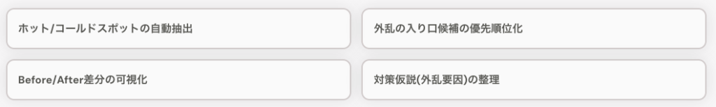 条件が揃えば、温度差×影響範囲から損失量の目安を簡易試算し、「どこがどれくらい負荷を増やしていそうか」を優先順位つきで提示