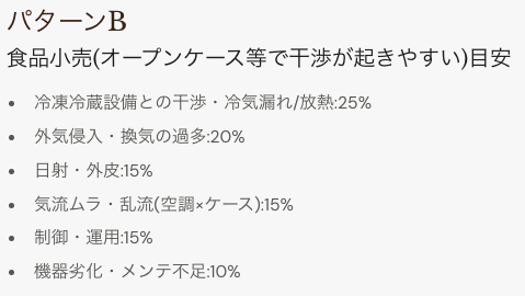 暑さ・湿度・日射、ドアの開閉、人の出入り、厨房の熱、換気量の変化、冷凍冷蔵設備との干渉…。