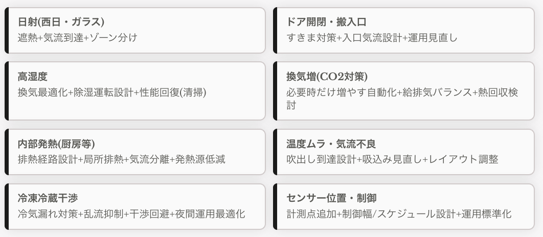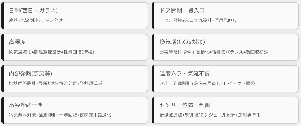 暑さ・湿度・日射、ドアの開閉、人の出入り、厨房の熱、換気量の変化、冷凍冷蔵設備との干渉…。