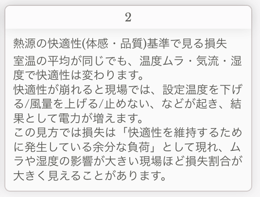 外乱や運用、気流ムラ、換気過多などが重なると、同じ快適性を得るために余計なエネルギーが上乗せされます。ここではそれを「損失(改善余地)」と呼びます。