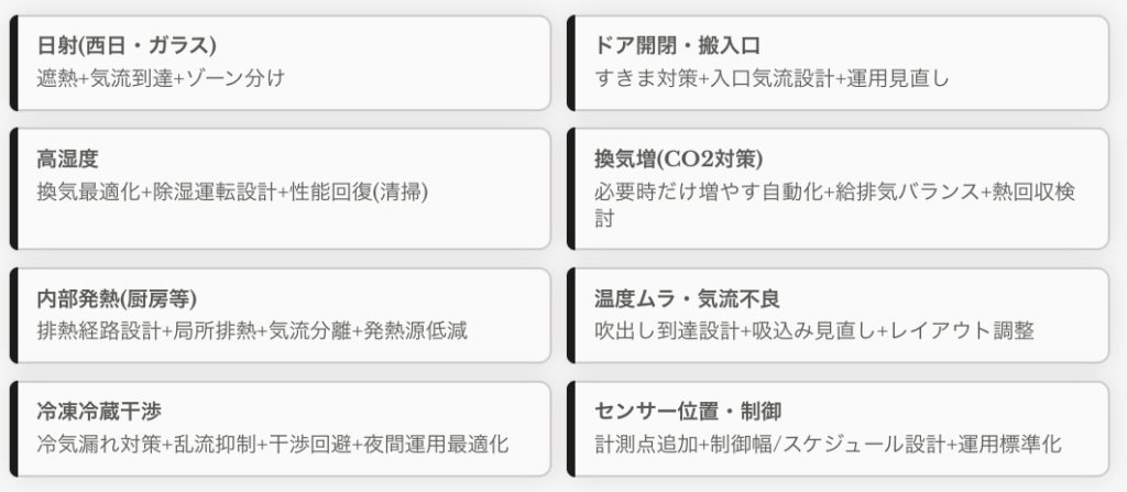 気象(外気)だけでなく、建物(断熱・すきま)、人の動き(出入り・人数)、換気(外気導入)、内部発熱(厨房・機械・照明)、気流(温度ムラ)、計測・制御(センサー位置)、機器状態(汚れ・劣化)にもまたがっています。